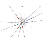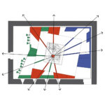 La maquette de Sauveterre médiévale créée par André-Joseph Gastellu est posée au cœur du dispositif scénographique, dans son orientation réelle. La tour devient le centre d’un rayonnement pointant les bâtiments remarquables présents sur le territoire élargi. Présentés dans des alcôves (rouge) en périphérie de la salle, ils sont complétés par des thématiques liées à l’histoire (bleu) ou au territoire (vert). Cette organisation scénographique crée du lien entre la maquette, les cadrages périphériques et le territoire, redonnant à la tour son rôle majestueux de point de vue stratégique.