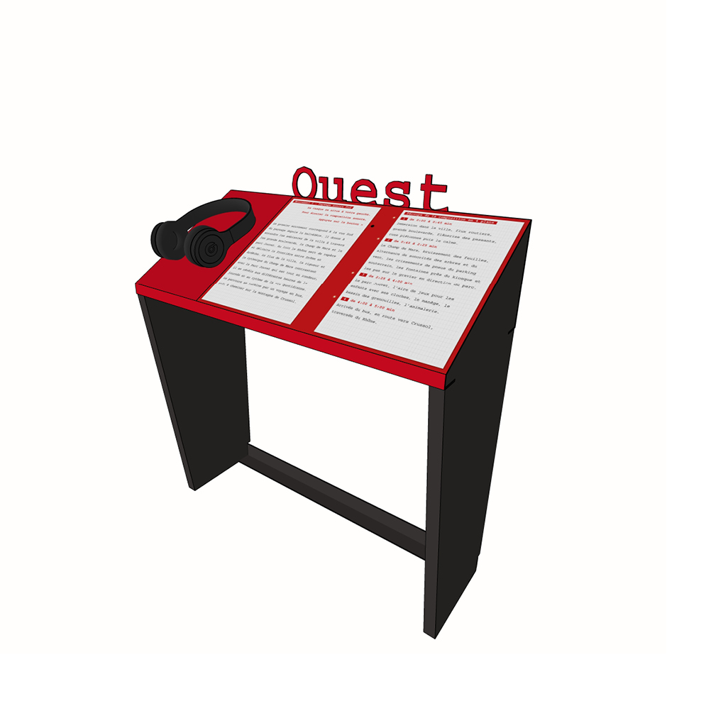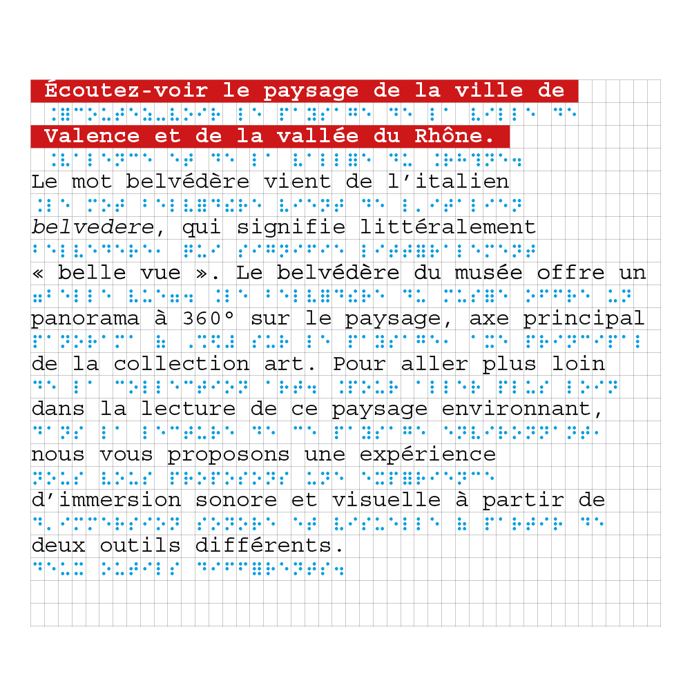 Dans le belvédère, quatre pupitres sont disposés face aux quatre points cardinaux. Ils permettent d’écouter les quatre paysages sonores, créations de l’artiste Sophie Agier. Ce dispositif auditif, adapté aux personnes porteuses d’un handicap visuel, est complété par une description écrite visuelle et braille. La typographie Courier à chasse fixe permet les lectures synchrones en calant la largeur de la chasse sur le caractère braille standardisé.