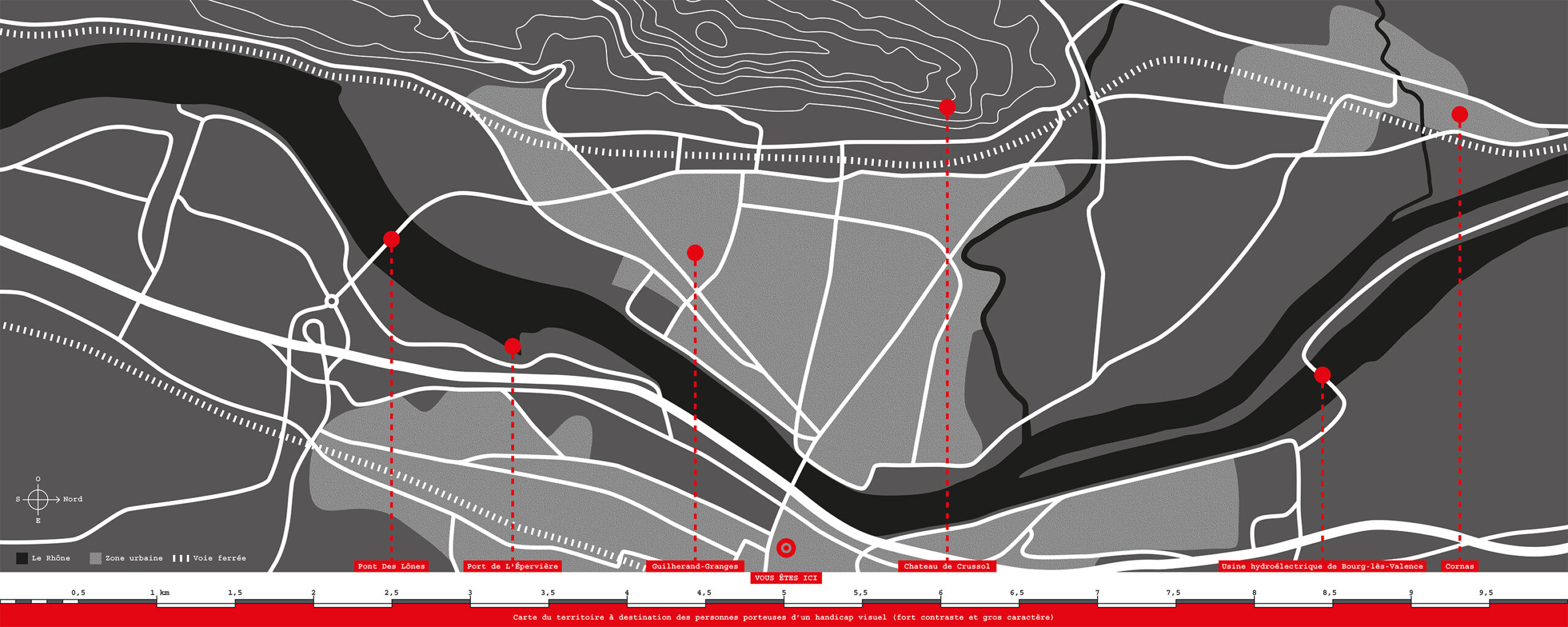 Sur la terrasse, face au Rhône, une carte du territoire à destination des personnes porteuses d’un handicap visuel (fort contraste et gros caractère), permet une approche géographique.